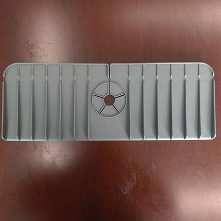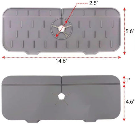 Try This Silicone Faucet Handle Drip Catcher Mat. This sturdy, flexible mat stays in place, drains well, and keeps the countertops dry